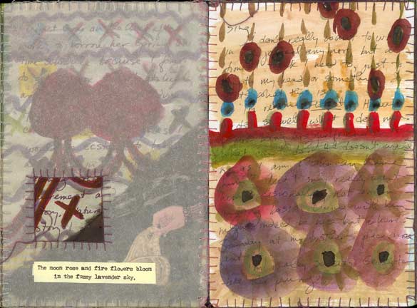 The moon rose and fire flowers bloom in the fuzzy lavender sky.