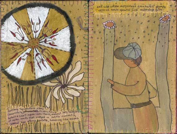 | | Suddenly Sorrowifera stood (mournfully, of course) transfixed before a small aquarium. Her mouth curled slowly upward and her face began to shine. There, amid tall, lacy tangles of water weeds that swayed in subtle currents, glowed two albino axolotls, hovering like moons. Each side of the motionless creature's fat, squarish heads sprouted whimsical pink radicchio gills.